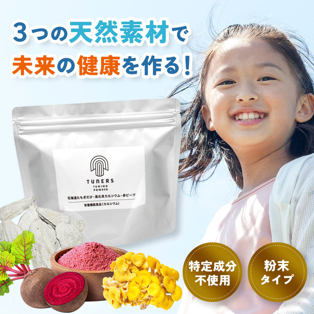 北海道たもぎだけ・赤ビーツ・風化貝カルシウムというこだわりの天然素材を使って余計なものは加えずそのまま粉末サプリメントにしました。飲み物やスープに混ぜて取り入れてください!