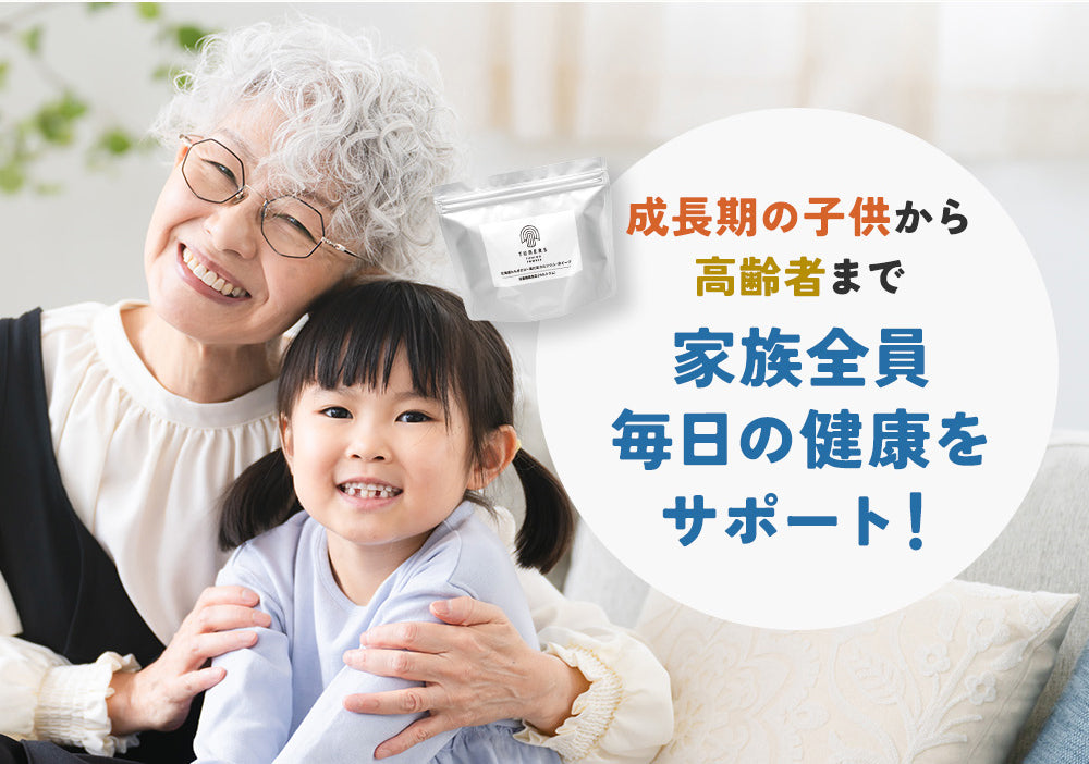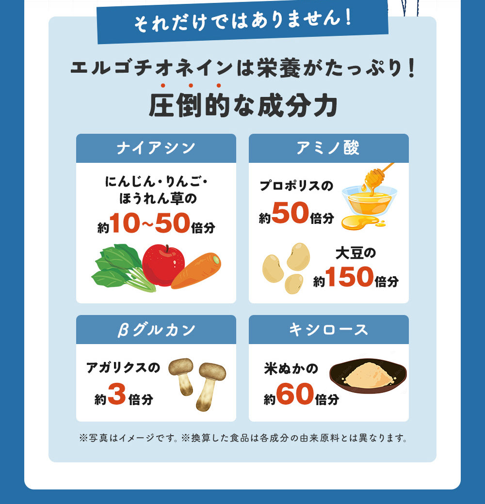 たもぎ茸粉末、赤ビーツ粉末、酵母、アムラ果実エキス末、ホーリーバジル葉エキス末、レモン果皮エキス末、カレーリーフエキス末、グァバ葉エキス末、貝カルシウム、ビタミンB12、ビタミンD3